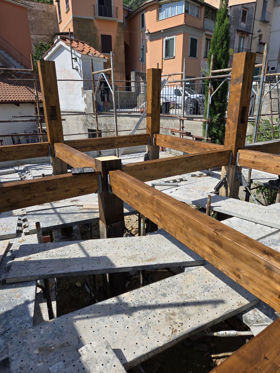 - Realizzazione di pilastri in c.c.a. in sostituzione delle parti di colonne in legno ubicate al di sotto del piano di calpestio del terreno. Questo intervento è finalizzato a contrastare il fenomeno di degrado degli elementi lignei e ad assicurare una maggiore durabilità della struttura.